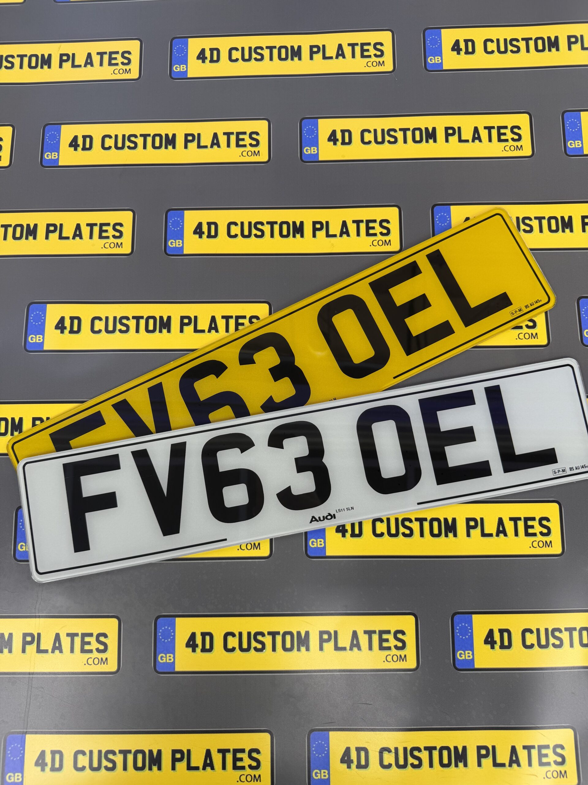 4D Laser Cut Plates are one of the latest styles in the Number Plate industry. They are made from 3mm Acrylic, laser cut, with Ultra-Strong 3M Adhesive. The Font used is Charles Wright font made to the exact legal size which fulfils the legal requirement for the letters and therefore are deemed Road Legal.